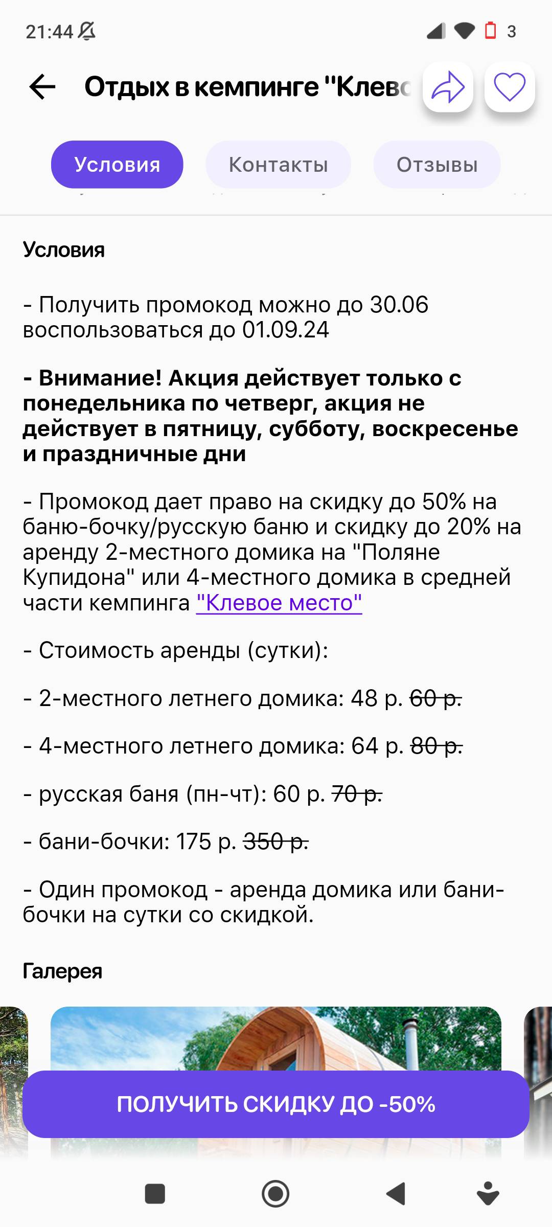 - Промокод дает право на скидку до 50% на баню-бочку/русскую баню и скидку 20% на аренду 2-местного домика на "Поляне Купидона" или 4-местного домика в средней части кемпинга "Клевое место"