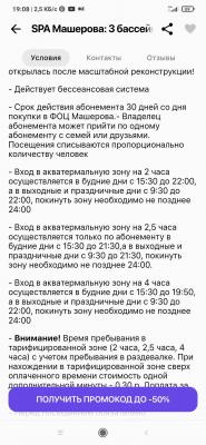 - Промокод также дает право на скидку 30% на безлимитное посещение "АкваТермальная зона + тренажерный зал + фитнес" в любой день недели