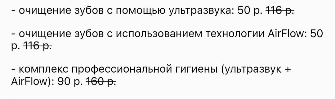 - очищение зубов с помощью ультразвука: 85 р. 170 р.