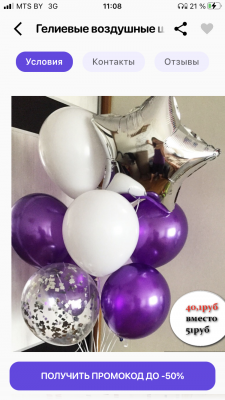 - Промокод дает право на скидку до 50% на оформление различными гелиевыми воздушными шариками вашего помещения/праздника