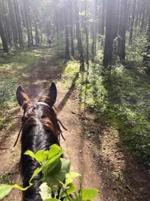 Индивидуальная шаговая прогулка, без других участников, только ваша пара и инструктор, две лошадки