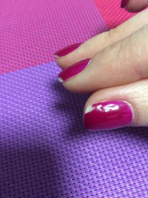 Фотографии все говорят без слов. Прошла неделя, что видно по незначительно отросшему ногти. Сколы пошли на 3 день. Неравномерность покрытия, наплывами, не полностью передается фото.