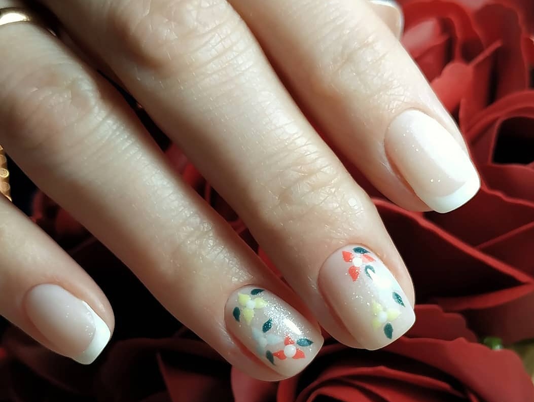 - коррекция ногтей + долговременное покрытие френч: