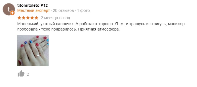 Мне очень нравиться как тут работают. Маникюр качественный, лак наносят под кутикулу. И маникюр носится достаточно долго. Желаю процветание всему салону и успехов мастерам Ольге и Марине.