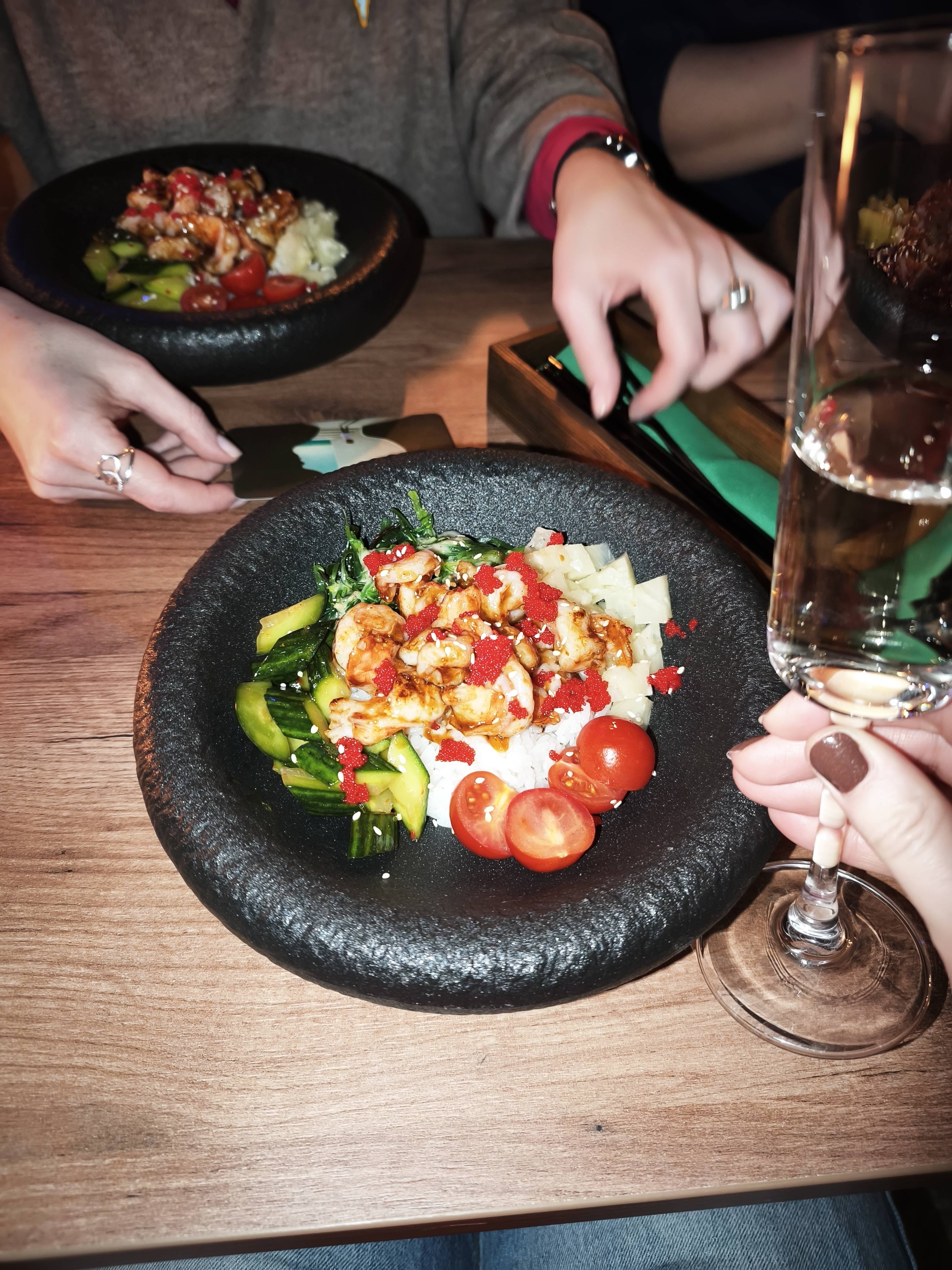 Состав: креветки, пекинская капуста, зелень, соевый соус, соус барбекю, лук