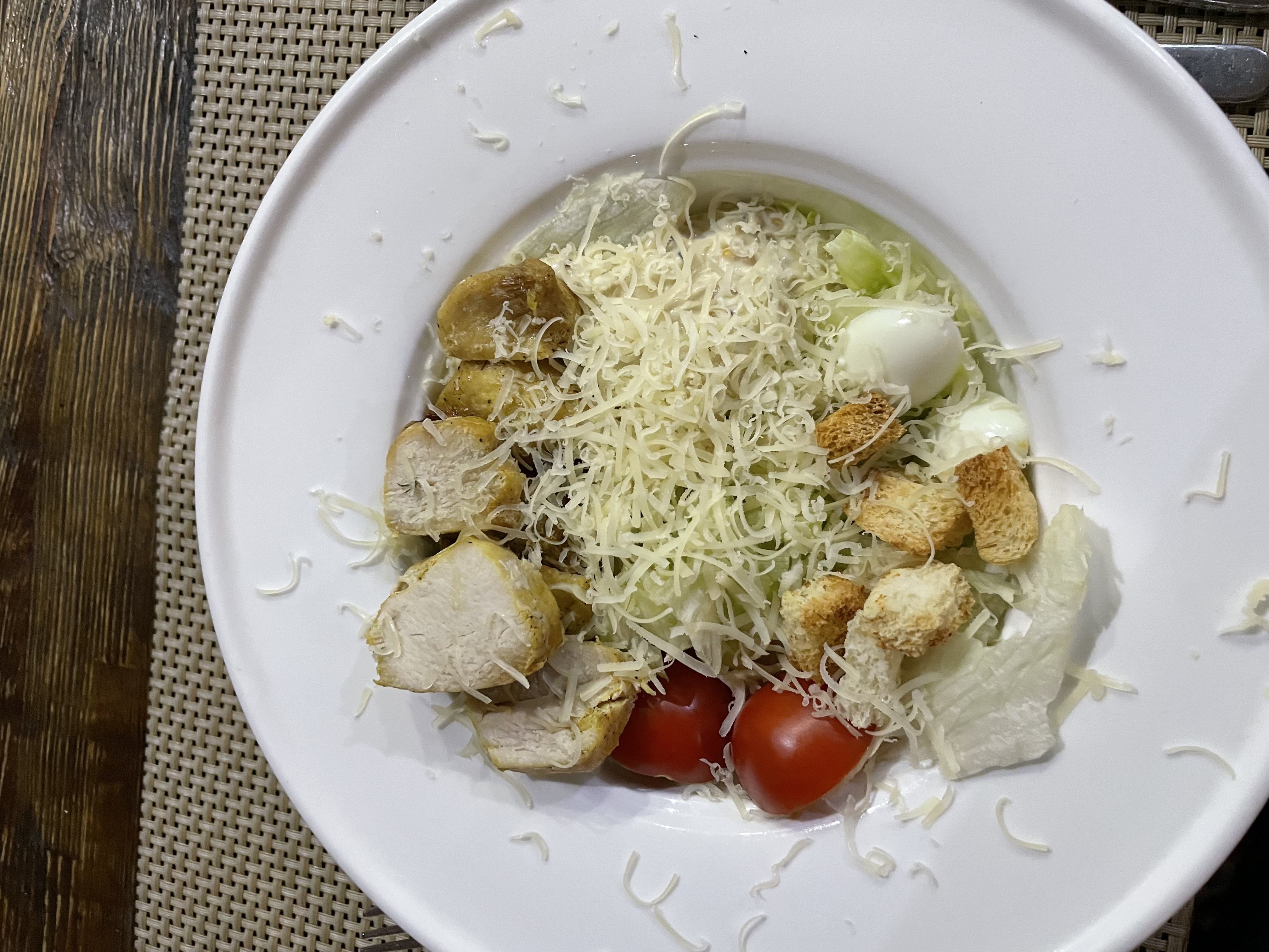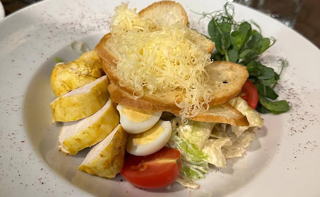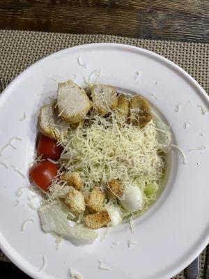 - салат "Цезарь с курицей" (250 г, 1 порция): салат айсберг, обжаренное филе куриное, яйцо перепелиное, томат черри, сыр пармезан, сухарики, соус цезарь