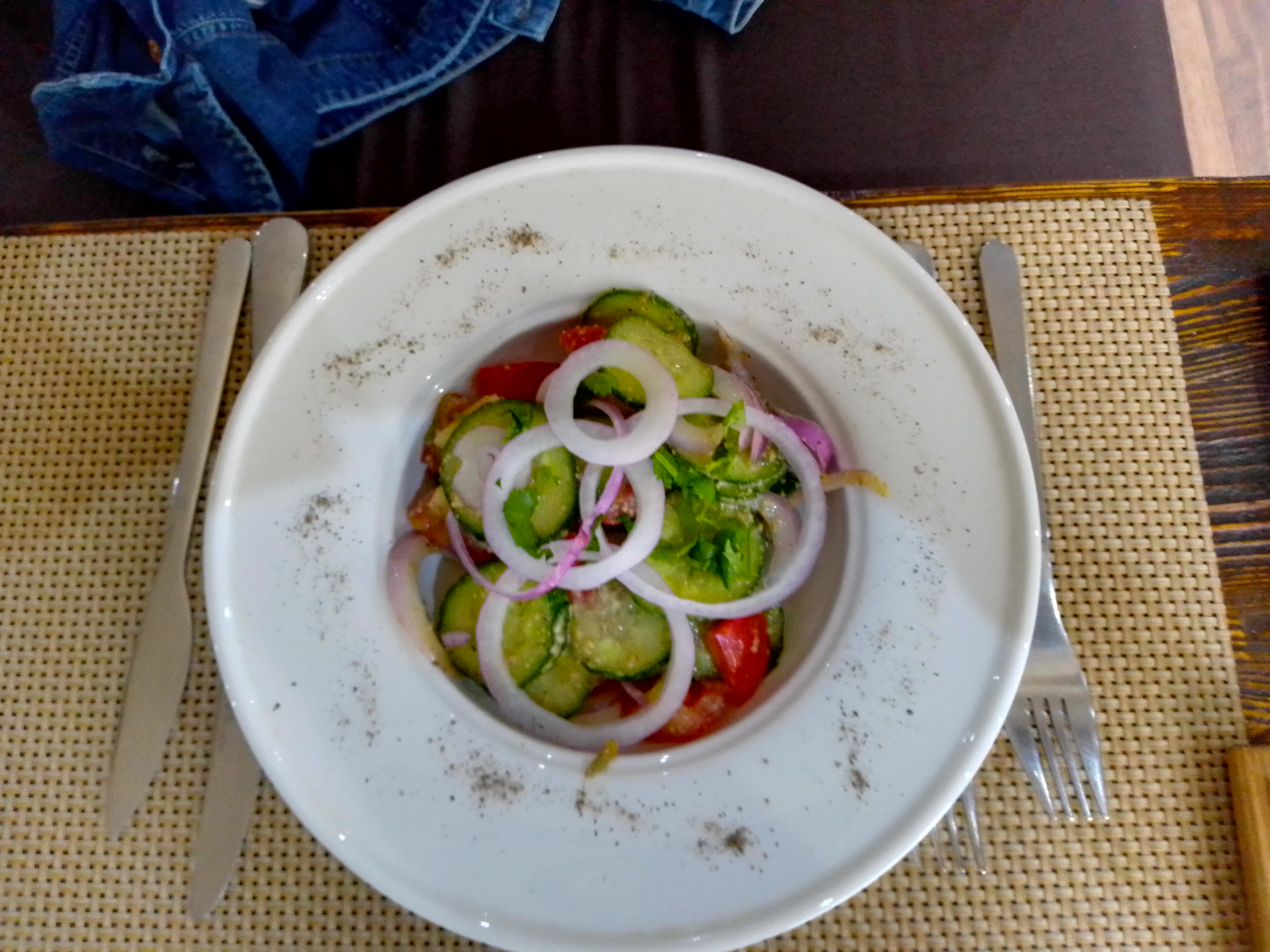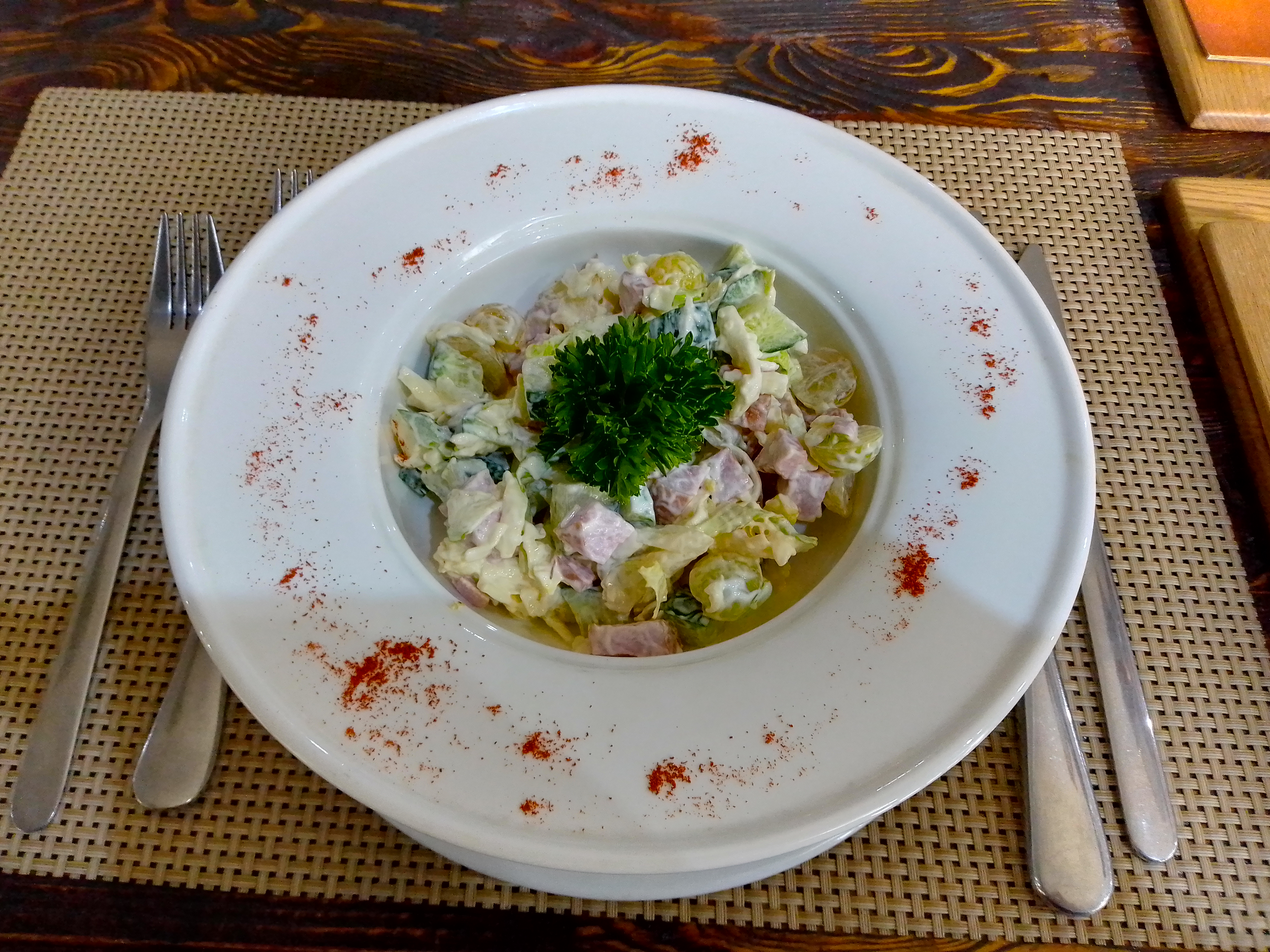 - салат "Грузинский" (250 г, 1 порция): томат, огурец, лук репчатый, зелень, заправка с грецким орехом