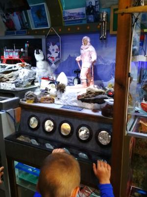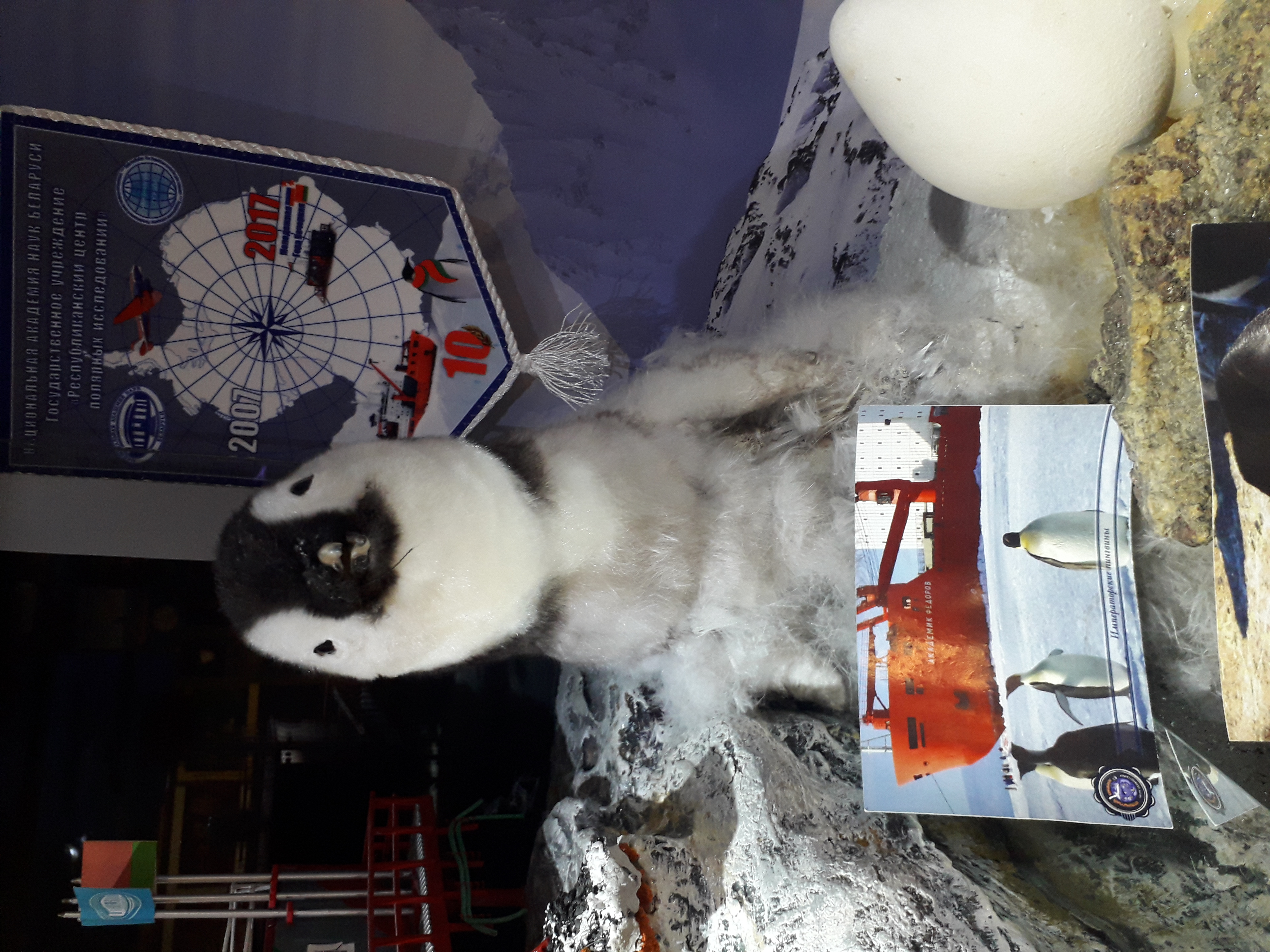 Вы увидите макет белорусской станции, в которой живут и работают полярники Белорусской Антарктической экспедиции, чучело пингвина, минералы, губку-стеклянницу, окаменевшее дерево из Антарктиды.
