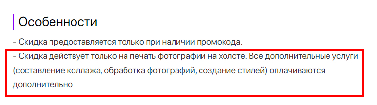 - Промокод дает право на скидку до 53% на печать фотографии на холсте