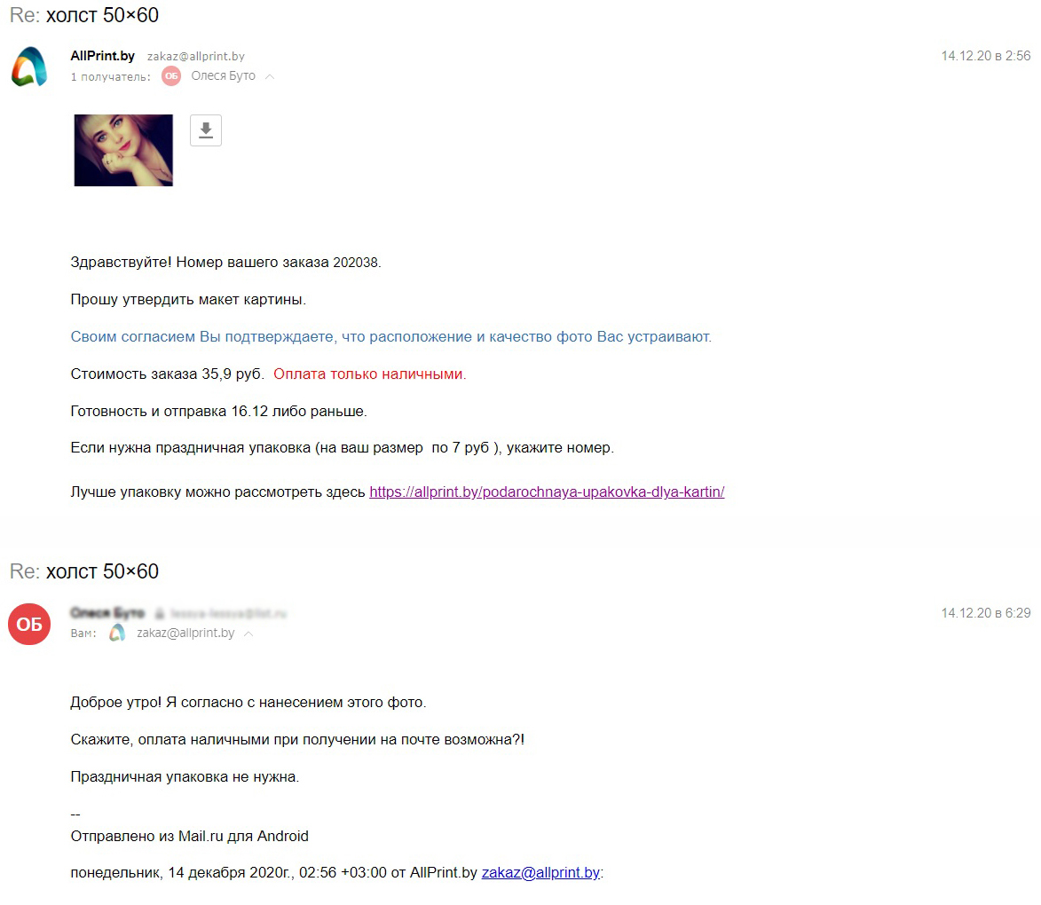 Заказ выполнили вовремя,в этом плане претензий нет. Дизайнер тоже свое дело сделал. Но помимо фото на холсте я заказала упаковку,в стоимость которой входит бумага и бант,которого я так и не увидела. В пункте на Козлов 7 забирала сама,туда заказ доставили сразу в упаковке,сказали,что посмотреть холст уже нельзя. Все же как-то странно заплатить деньги без просмотра. Об этом никтотне предупреждал. Поэтому до Дня рождения про качество сказать ничего не могу. Но претензии по упаковке есть, не нужно обманывать и брать деньги, если она не полная. Могу поставить 3,5 звезды