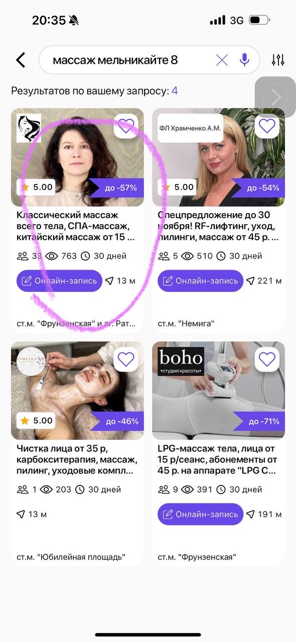 Не мог найти акцию для получения промокода. Их было несколько по запросу Массаж Мельникайте. Татьяна подсказала с какой-то женщиной мастером на фото. И оказалось это была она. Но в жизни Татьяна оказалась и симпатичнее и приятнее. Задача сменить фото.