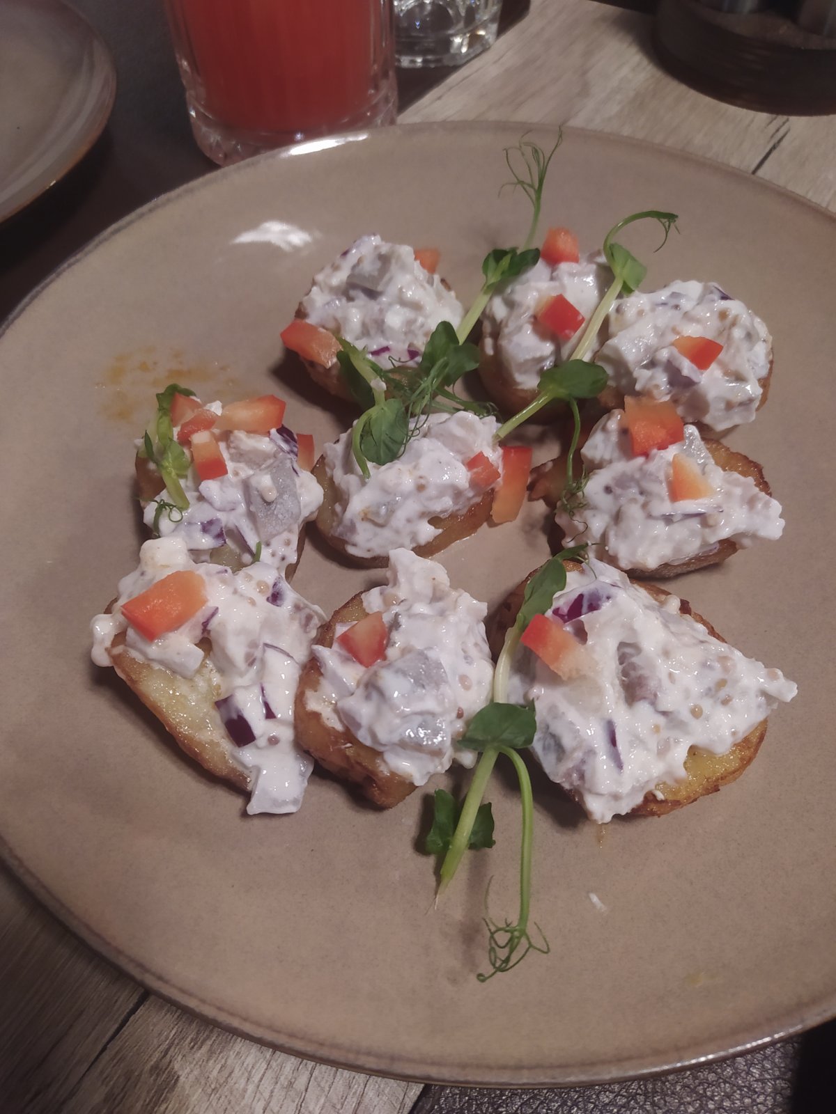 - Закуска из сельди с картофелем. Рубленная сельдь с маринованным красным луком смешанная со сметаной с горчицей, подана на запеченном картофеле: сельдь филе, лук красный, горчица французская, горчица Дижонская, сметана, картофель запеченный целиком в кожуре