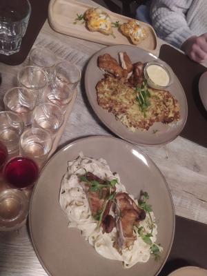 Довольно уютное для большого пространства место. Брали два сета (мясной и с драниками) на пробу. С драниками понравился больше из-за разнообразия выбора, но это дело вкуса. Само мясо было хорошим. Особенно понравились грибочки, они редко бывают вкусными (часто пресные). По еде все хорошо, а вот марку безалкогольного пенного напитка лучше заменить, оно было ужасное (есть намного лучше у отечественного производителя). Но, оцениваю еду, поэтому 5 звезд.