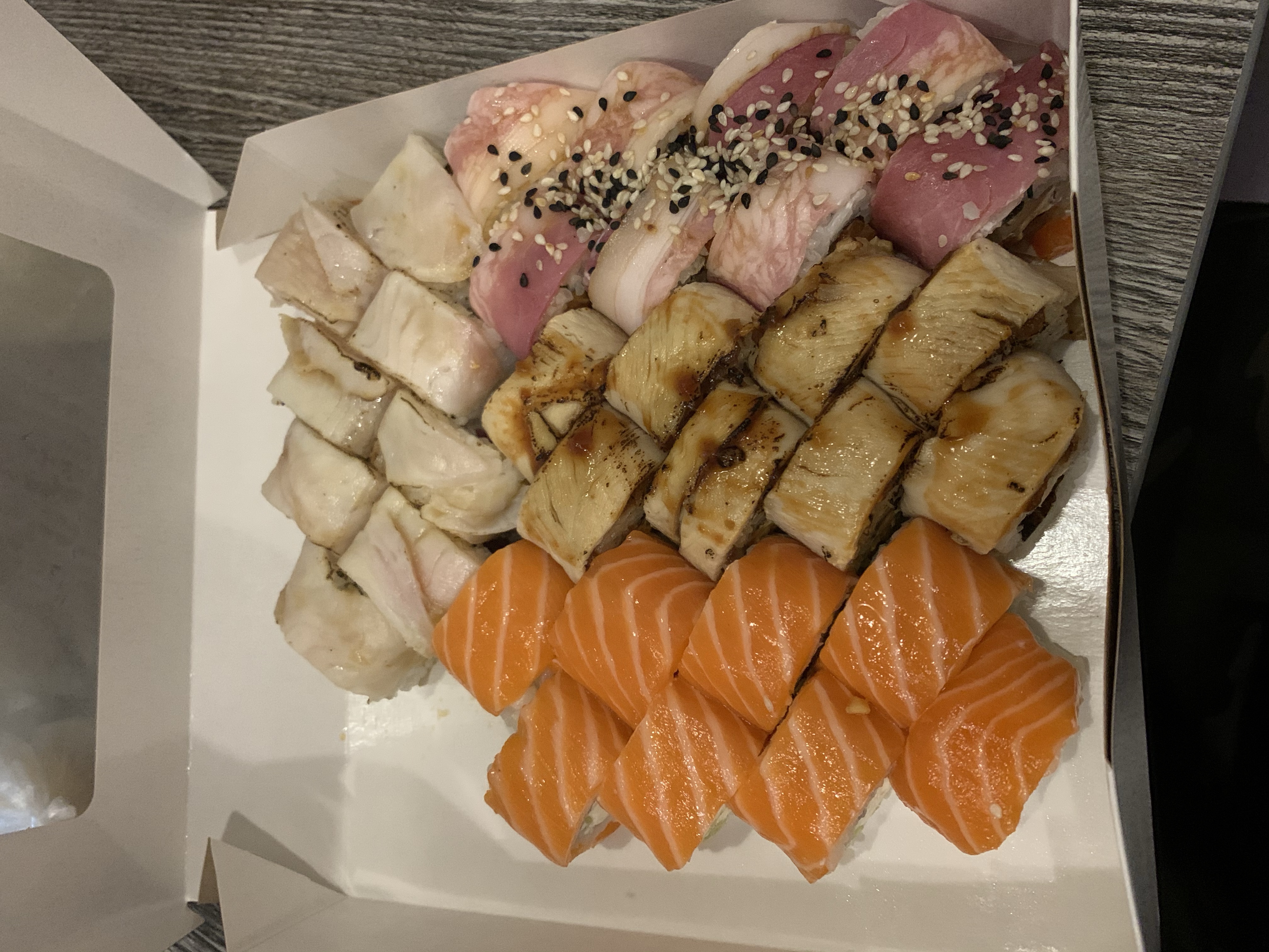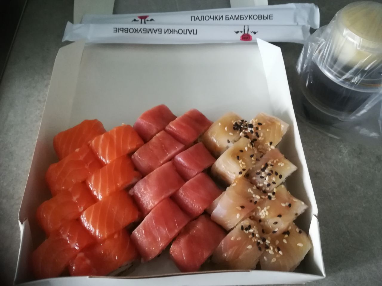 Заказ делали в ночное время (около полуночи), возможно, днём к качеству продукции относятся серьезнее. Сет трипл Фиш.