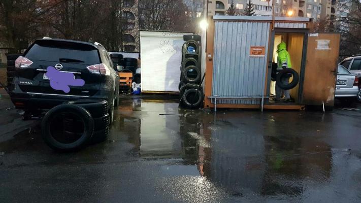 У нас, как вы выразились в будке места нет, чтобы развернуться, уже не говоря о том, чтобы ещё резину складывать там, резина складывается на улице.