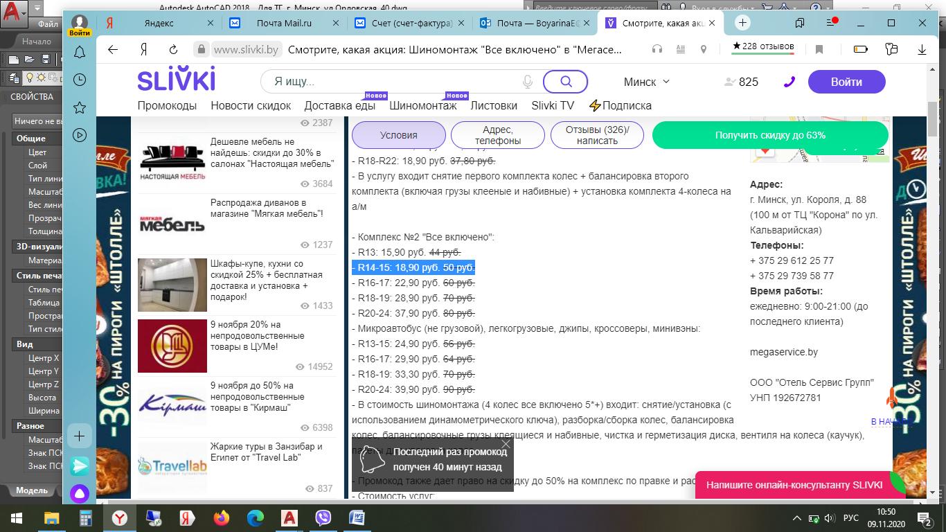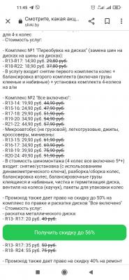 - Промокод дает право на скидку до 45% на комплексы для 4-х колес "Замена шин на дисках" и "Шиномонтаж "Все включено"