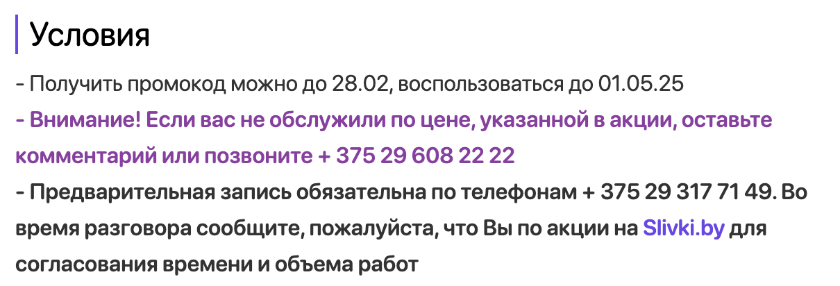 - Предварительная запись обязательна по телефонам + 375 25 781 43 38. Во время разговора сообщите, пожалуйста, что Вы по акции на Slivki.by для согласования времени и объема работ