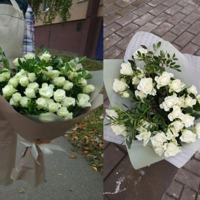 Вас предупредили , что белые розы в данный момент не пышные и предложили другой сорт. Вы настояли на белых. А теперь высказывание недовольства. Тем более , что букет вы не забрали, и никто вас особо и не заставлял, так как он не только на ваш , но и на наш взгляд, не соответствует ожиданиям. Жаль потраченного времени флориста и курьера. В следующий раз, советуем слушать и слышать, что вам говорят!