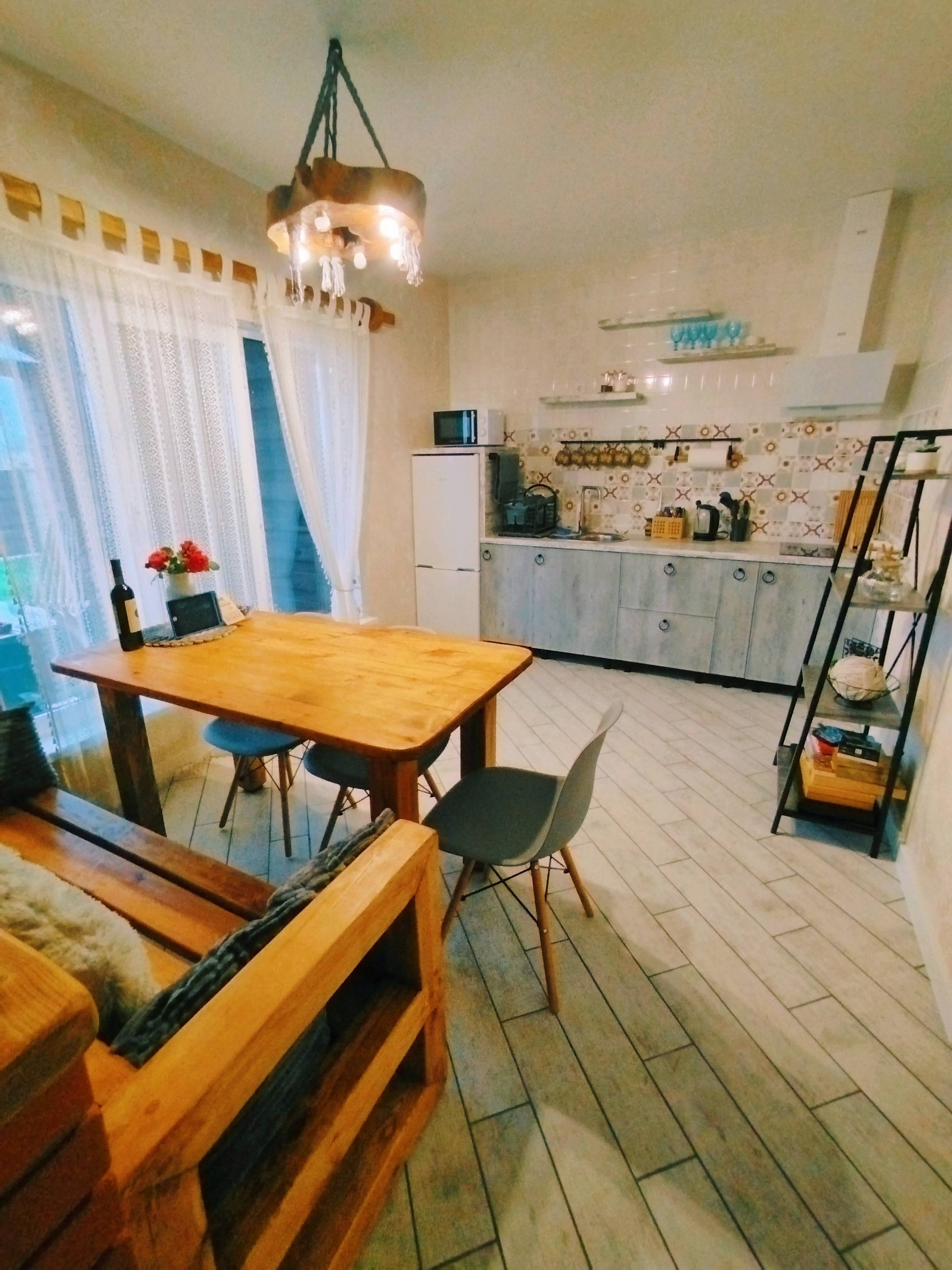 - В стоимость входит: wi-fi, два телевизора Smart TV, оборудованная кухня, музыкальная колонка, уютная терраса с деревянной мебелью, мангал, батут, дартс, велосипеды, настольные игры