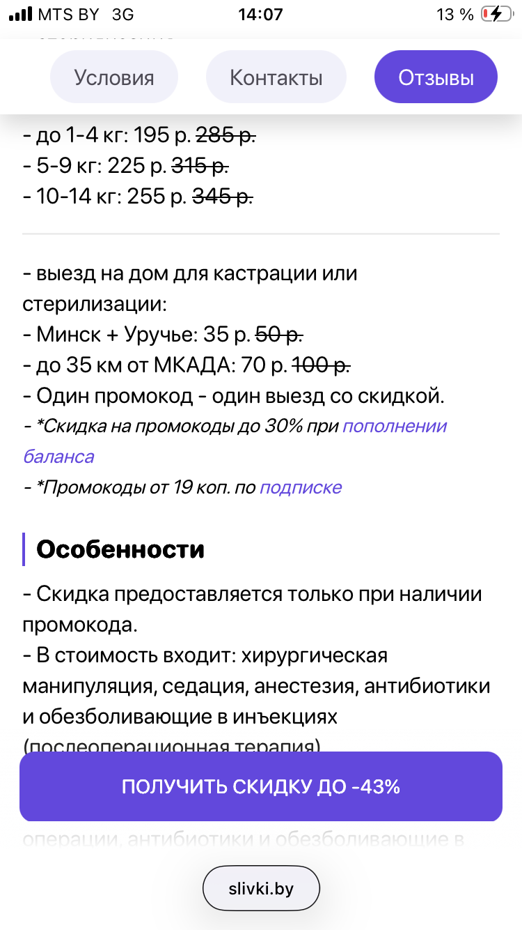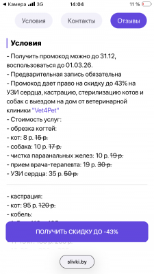 - Промокод дает право на скидку до 43% на УЗИ сердца, кастрацию, стерилизацию котов и собак с выездом на дом от ветеринарной клиники "Vet4Pet"