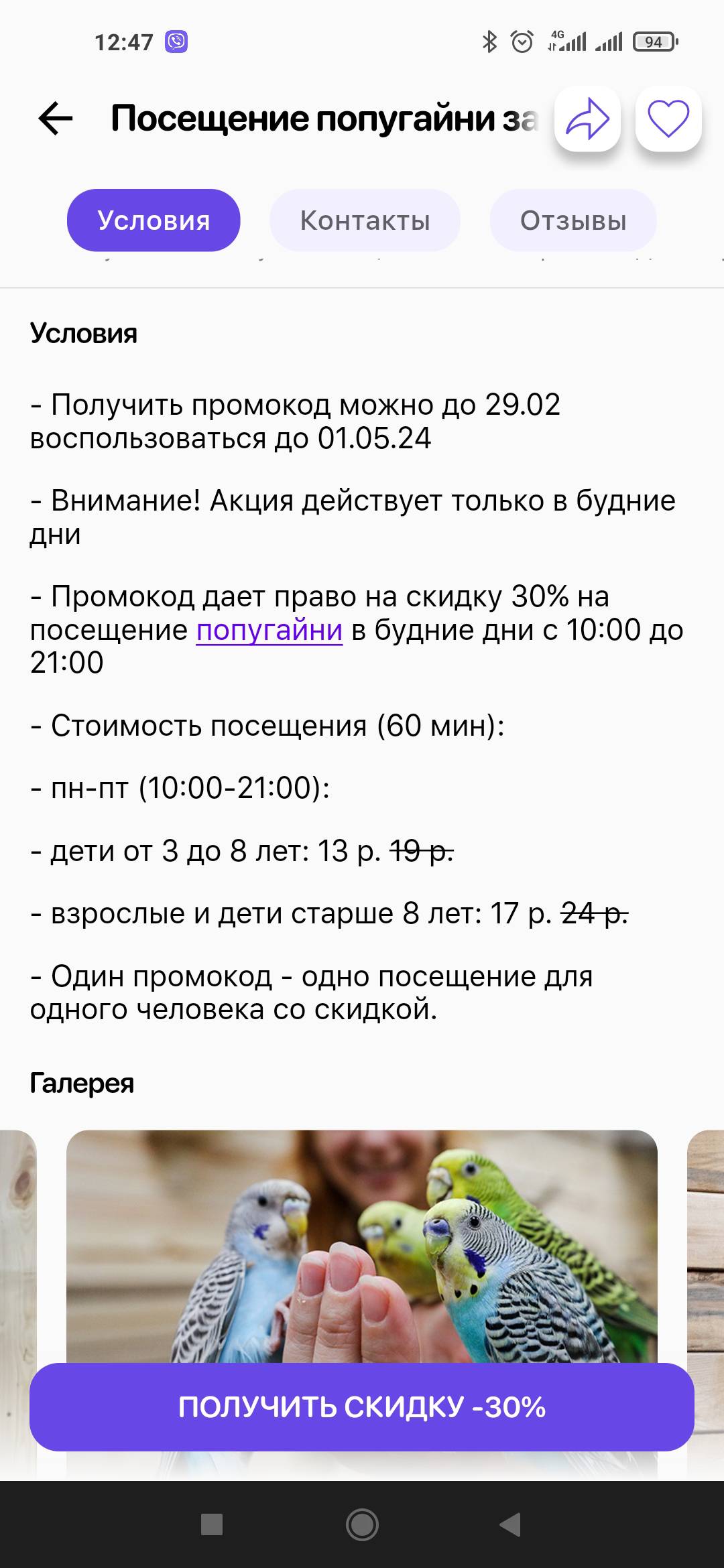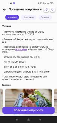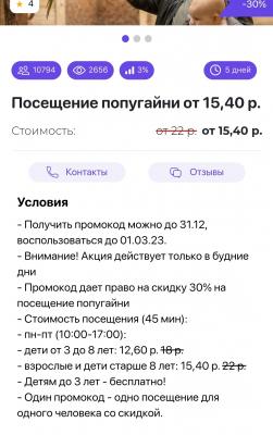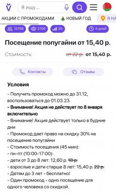 - Промокод дает право на скидку до 32% на посещение в будние дни попугайни